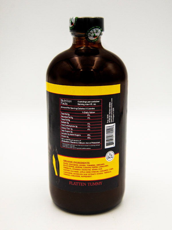 Water, Fenugreek, Ginger, Turmeric, Oregano, Black Pepper, Ginseng, Cayenne Pepper, Caralluma, Fimbriata, Gymnema Sylvestre, Senna Leaf, Slippery Elm Bark, Apple Cider Vinegar, Cinnamon, Cumin, Cardamom, Dandelion Leaf Extract, Gugoul, Triphala, Gurmar, Coriander, and Peppermint.