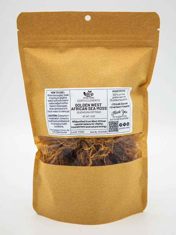 At 40 Day Living, we hand-pack each pouch in small batches to honor the purity and heritage of this traditional sea vegetable. No additives. No salt preservatives. Just clean, golden sea moss the way nature intended.