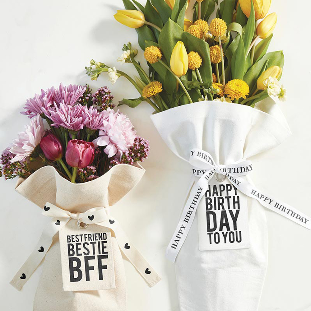 Perfect for gifting bouquets on special occasions, THE BOUQUET BAG© is a reusable canvas bag with a water resistant lining at the base to keep the bag dry while holding your gorgeous bouquet. With sentimental phrases on the ribbon and a special canvas gift tag, these bags make the perfect gift for any day of the week! Includes a leather loop for hanging on the back of the bag.