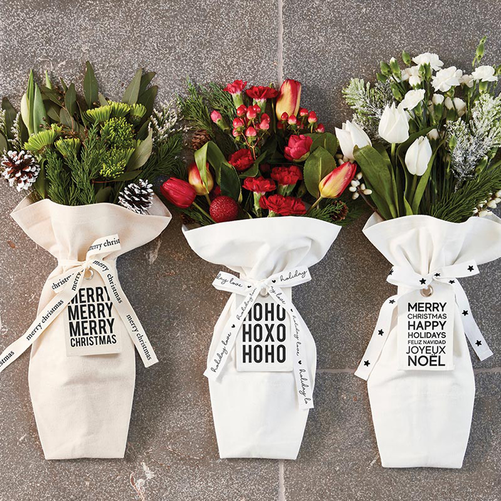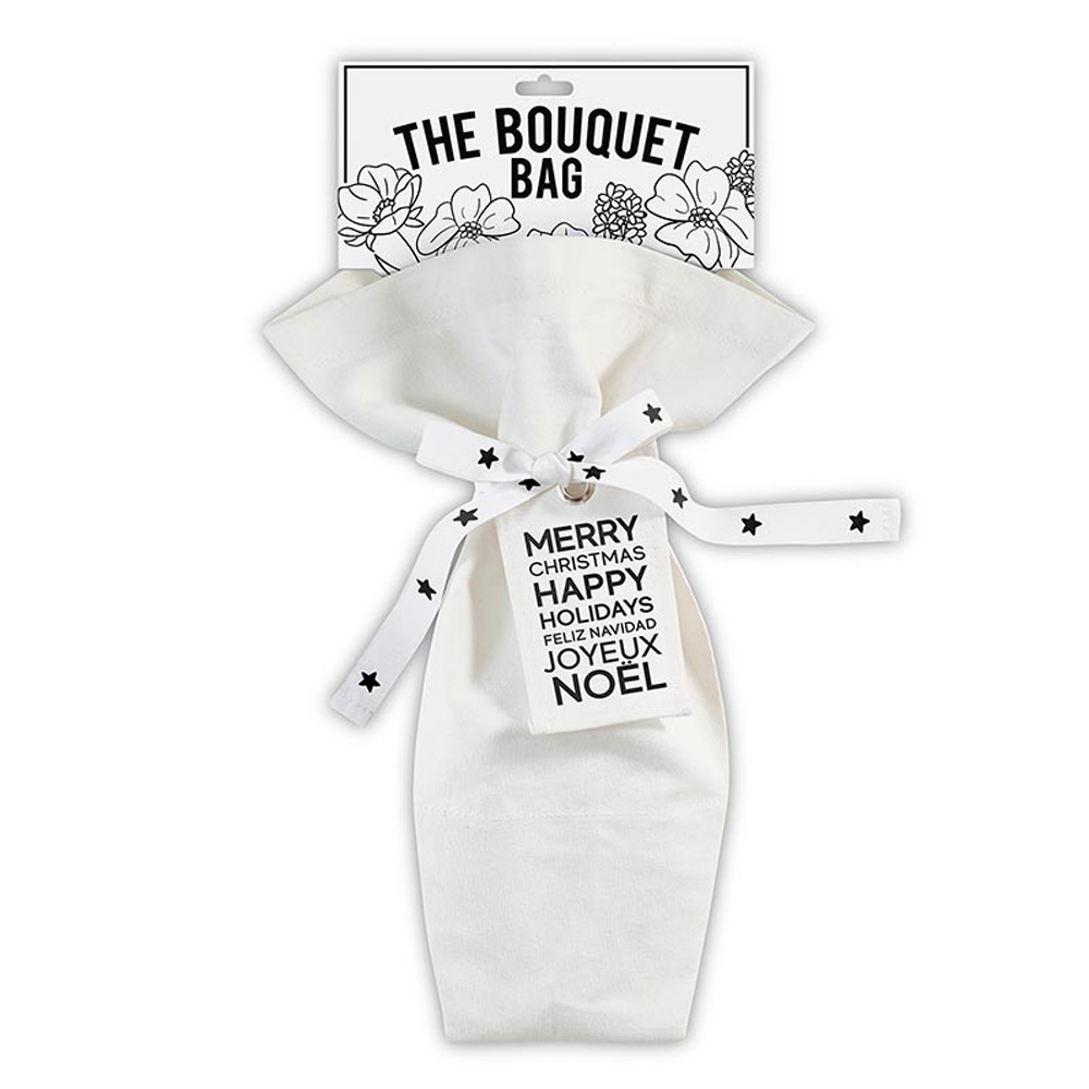 Perfect for gifting bouquets on special occasions, THE BOUQUET BAG© is a reusable canvas bag with a water resistant lining at the base to keep the bag dry while holding your gorgeous bouquet. With sentimental phrases on the ribbon and a special canvas gift tag, these bags make the perfect gift for any day of the week! Includes a leather loop for hanging on the back of the bag.