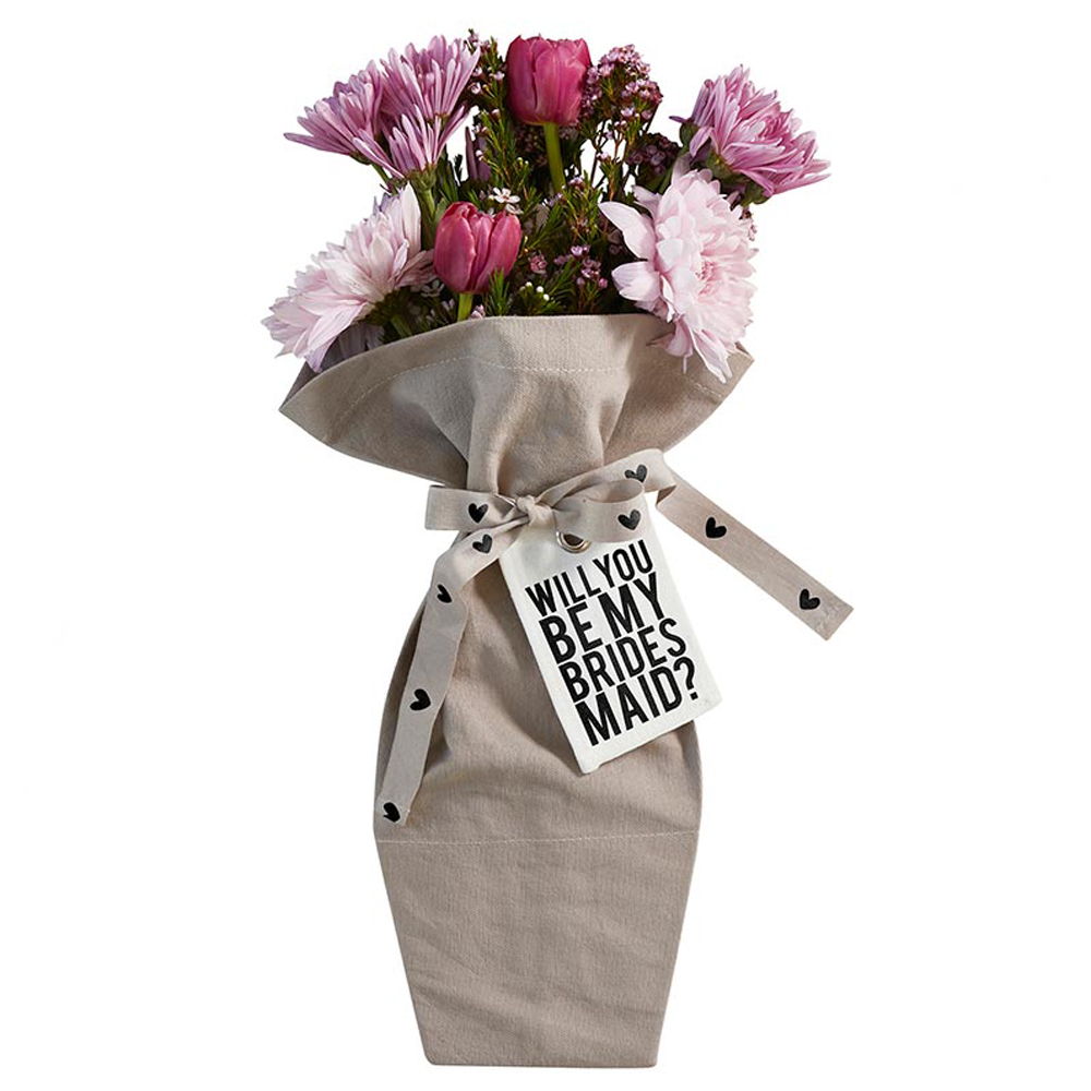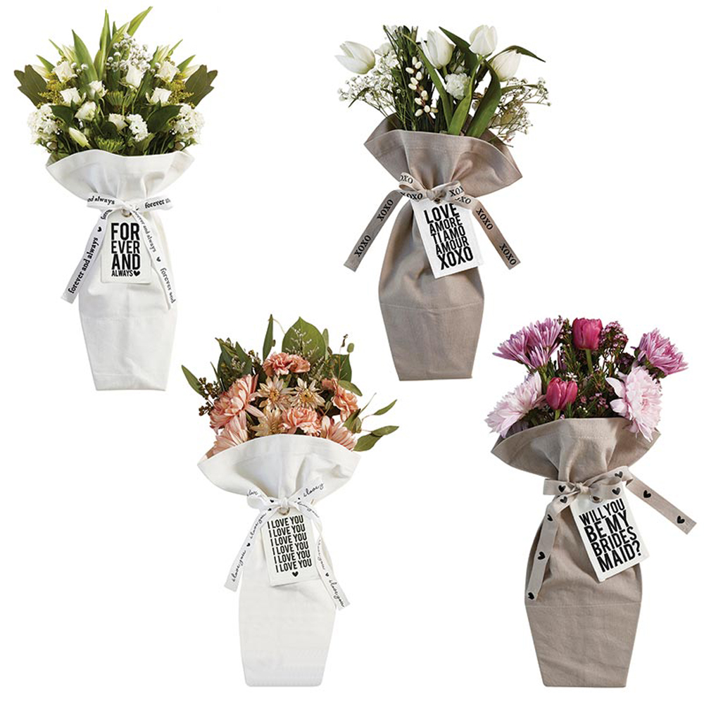 Perfect for gifting bouquets on special occasions, THE BOUQUET BAG© is a reusable canvas bag with a water resistant lining at the base to keep the bag dry while holding your gorgeous bouquet. With sentimental phrases on the ribbon and a special canvas gift tag, these bags make the perfect gift for any day of the week! Includes a leather loop for hanging on the back of the bag. Includes 2 pieces each of L6520 -L6523 (8 pcs)